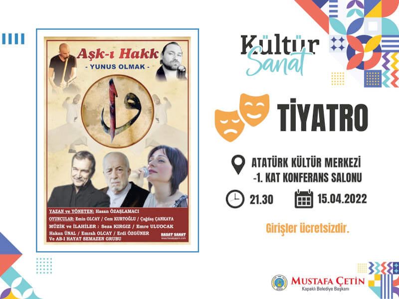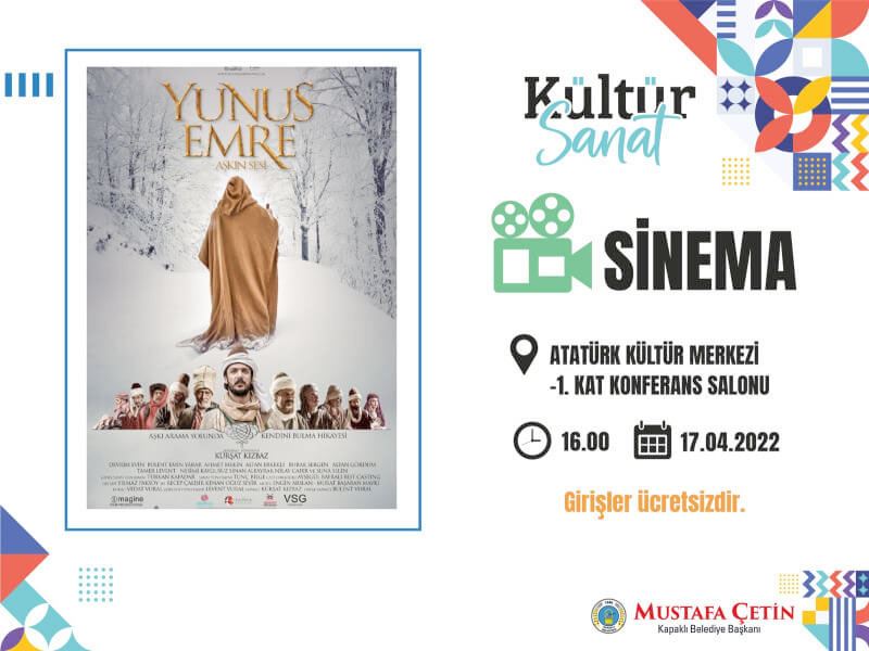 Kültür sanat etkinlikleri kapsamında 15 Nisan Cuma saat 21.30’da Aşk-ı Hak Yunus Emre Müzikali Kapaklılarla buluşacak. 17 Nisan Pazar günü saat 16.00’da da Yunus Emre Aşkın Sesi filmi gösterilecek.