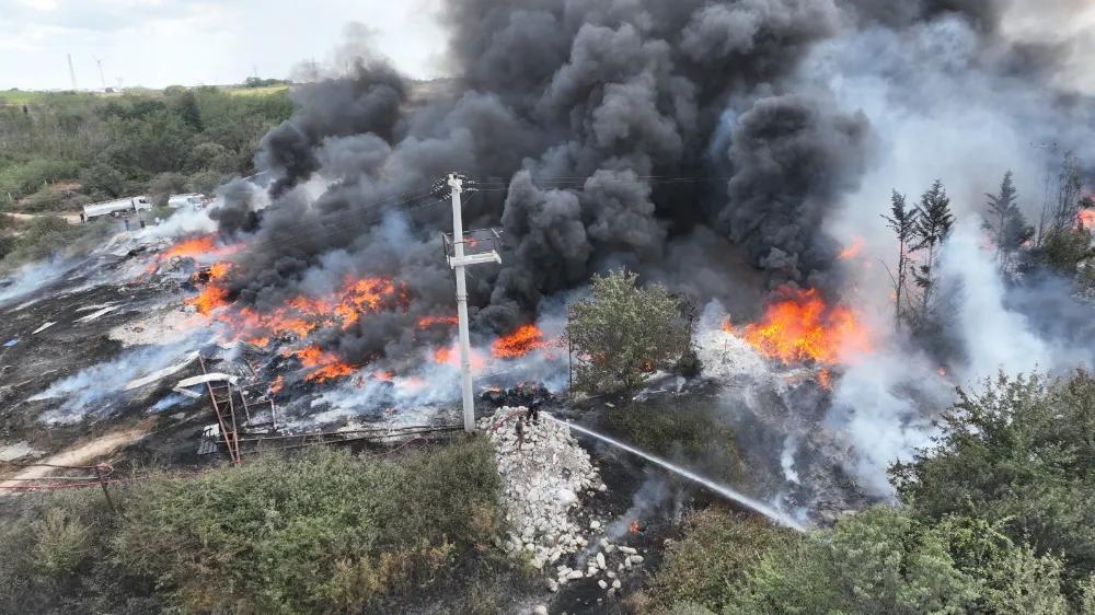 Tekirdağ’ın Ergene İlçesinde önce otluk alandan çıkan ve daha sonra geri dönüşüm tesisine sıçrayan yangın dron ile havadan görüntülendi.