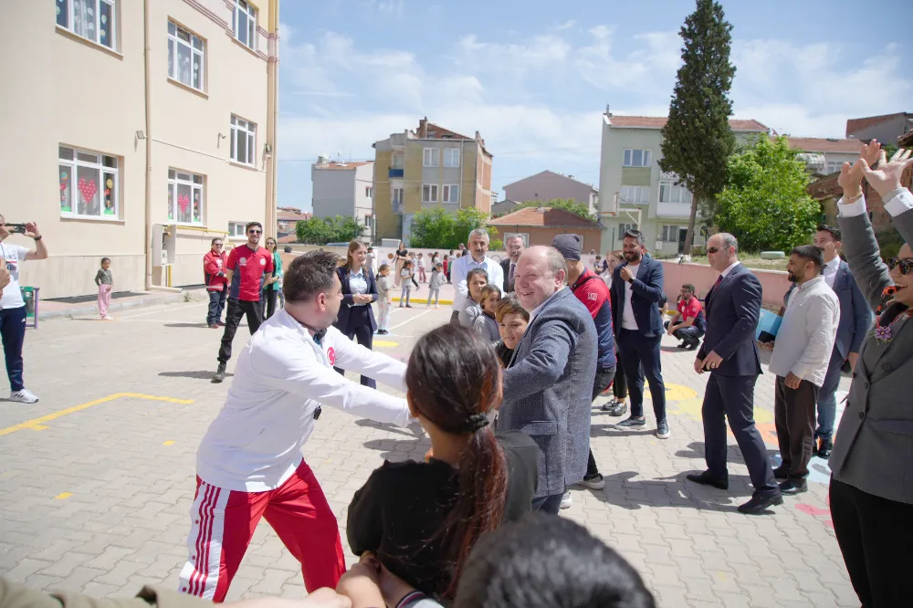 Edirne Valisi Yunus Sezer, "Öğrencilerin hem akademik başarılarını artırmak hem de sosyal, sportif ve kültürel gelişimlerine katkı sağlamayı hedefliyoruz. Öğrencilerimizin okula devamıyla ilgili sıkıntı yaşıyoruz sene başından beri. Çocuklarımızı okulu sevdirme, okulla ilgili olarak aileleriyle okulu bir araya getirme ve çocuklarımızı evlerinde ziyaret ederek eksikleri varsa onları bir şekilde giderme ve her halükarda çocuklarımızın okullara devamını sağlama amacıyla bir dizi proje yürüttük. Yaklaşık 1300’e yakın devamsız öğrencimiz vardı. Bu öğrencilerimizin şu anda neredeyse tamamı devam eder duruma geldiler. Bu söylediklerim sürekli devamsız öğrencilerimizdi. Şimdi öğrencilerden çok az bir kısmı bazen işte aralıklı olarak devamsızlık yapıyorlar. Onlarla ilgili de çalışmalarımız devam ediyor. Burada çocuklarımız hem okulu sevsinler, hem gelsinler burada enerjilerini atsınlar, hem de geleneksel oyunlarımızı öğretelim diye hocalarımız, öğretmenlerimiz, müdürümüz, milli eğitimimiz yoğun bir çaba içerisinde. Burada da okul bahçesini geleneksel oyunların oynanabileceği şekilde dizayn etmiş durumdalar. Biz de çocukluğumuzu hatırladık. Burada hem halat çekmece, hem topaçla ilgili topaç döndürmece, bunlar çocukluğumuzda çok vardı. Şimdi çocukların, yeni neslin de bunu öğrenmesi bizim açımızdan çok önemli. Hem eğleniyorlar, hem öğreniyorlar, hem de geleneksel oyunlarımızı unutmuyorlar, hem de okulu seviyorlar. Bu çok önemli, çocukların okulu sevmeleri çok önemli” dedi.