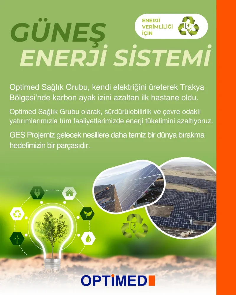Optimed Sağlık Grubu’ndan yapılan açıklamada, “Optimed Sağlık Grubu, sosyal sorumluluk bilinciyle hareket ederek çevre dostu ve sürdürülebilir sağlık hizmeti anlayışı doğrultusunda güneş enerji sistemini faaliyete geçirmiştir. Bu sayede doğaya duyarlı bir enerji kaynağı kullanarak hem karbon ayak izini azaltmayı hem de geleceğe daha temiz bir çevre bırakmayı amaçlamaktadır.” denildi.