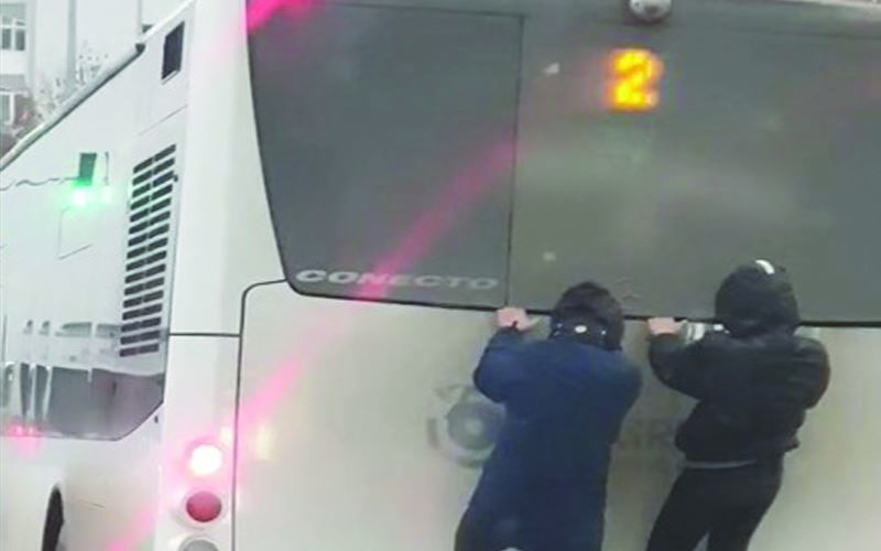 Tekirdağ’da otobüsün arkasına tırmanarak yolculuk eden iki gencin can güvenliğini hiçe saydığı anlar, bir vatandaşın telefon kamerasıyla görüntülendi.