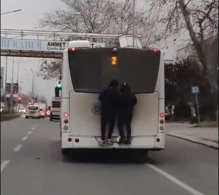 Trafikte seyreden halk otobüsüne tutunarak yolculuk eden iki genç, başlarına gelebilecek kaza tehlikesini umursamadı. Çorlu ilçesi Kazımiye Mahallesi Salih Omurtak Caddesi üzerinde iki gencin, otobüsün arkasına tutunarak yolculuk ettiği o anlar, bir vatandaşın telefon kamerasına takıldı.