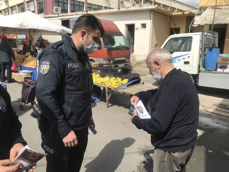 Polisten pazar yerinde dolaşarak, dolandırıcılara karşı vatandaşları ve esnafı uyardı.