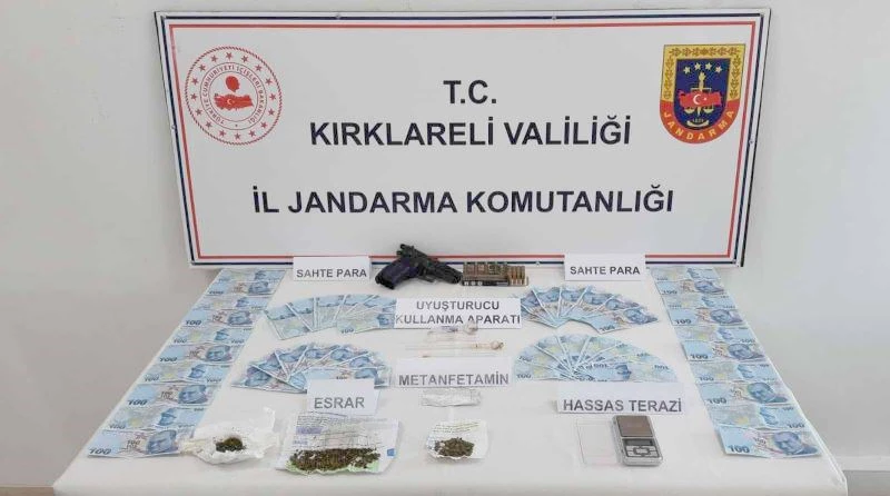 Alınan bilgiye göre, Babaeski ilçesinde piyasaya sahte para ve uyuşturucu sürüldüğü bilgisine ulaşan jandarma ekipleri çalışma başlattı. İl Jandarma Komutanlığı Kaçakçılık ve Organize Suçlarla Mücadele Şubesi ekipleri şüphelinin evine operasyon düzenledi. Operasyonda 100 liralık sahte 50 banknot, 12,21 gram kubar esrar, 13,89 gram metamfetamin, hassas terazi, 3 yeşil reçeteye tabi hap ile silah ele geçirildi.
