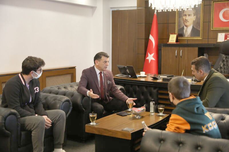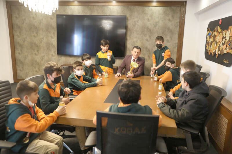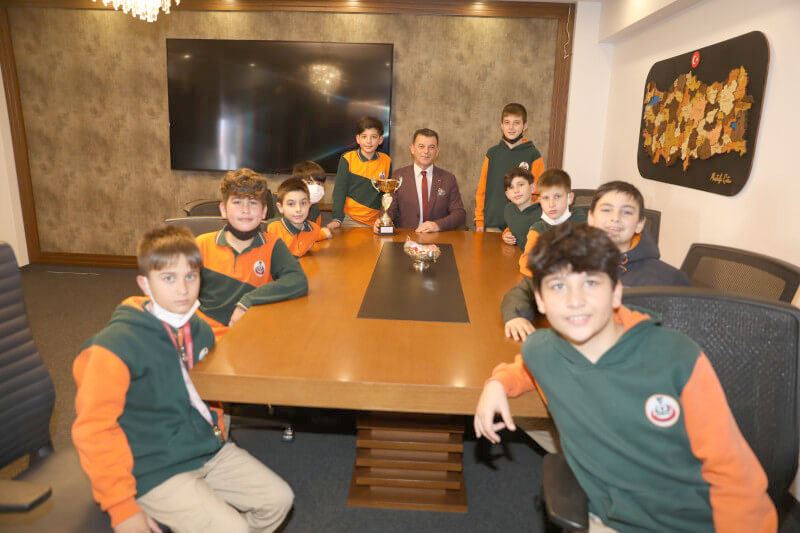 Başkan Çetin, ziyaret sonunda şampiyon öğrenciler Mert Gürel, Sadık Yaman, Ahmet Can Arifoğlu, Metehan Öziç, Gökberk Doruk Soyak, Doruk Aras Menemen, Olcay Korkmaz, Ada Uslu, Efe Vatansever ve Sefa Aygün, Okul Müdürü Levent Akın ve beden eğitimi öğretmeni Sergen Güner hatıra fotoğrafı çektirdi.