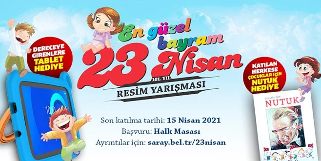 "Haydi çocuklar, en güzel bayramımız 23 Nisan?ı hayallerimizle süsleyelim. Saray Belediyesi?nin düzenlediği resim yarışmasına katılmak ister misiniz? Yarışmaya katılmak için; 15 Nisan 2021 Perşembe saat 17.00?ye kadar, `Hayalimdeki 23 Nisan` konulu resimlerinizi Saray Belediyesi bünyesindeki Halk Masası birimine ulaştırabilirsiniz. İki kategoride gerçekleştirilecek yarışmada birinci grupta 2014-2017, ikinci grupta ise 2009-2013 yılında doğan çocuklarımız yer alacak.Yarışmaya katılan tüm eserler 16 Nisan 2021 Cuma günü Saray Belediye Başkanlığı?nın facebook sayfasında yayınlanacak. Yayınlanan resimler içinde kendi kategorisinde en çok beğeni alan ilk üç eser dereceye girecek. Dereceye giren çocuklarımıza Saray Belediyesi tarafından tablet armağan edilecek. Yarışmaya katılmak için eserlerini Halk Masası birimize ulaştıran tüm çocuklarımıza ise ?Çocuklar için Nutuk? kitabı armağan edilecek.?