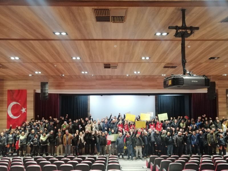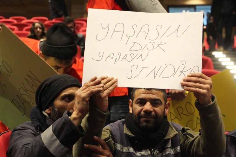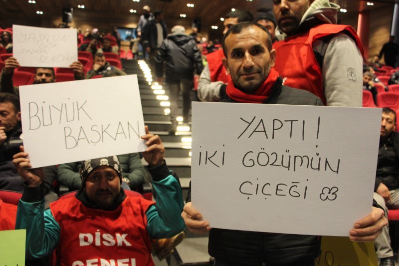 Davul zurnalarla imza törenine gelen işçiler ‘Yaptı İki Gözümün Çiçeği’, ‘En Büyük Başkan’, ‘Bizim Özgenin Fendi Enflasyonu Yendi’, ‘İşçinin Emekçinin Başkanı’, ‘Yüzde Yüz Başkan’, Yaşasın DİSK, Yaşasın Sendika’, ‘Amaro Cavo Özgen’ pankartları ile Saray Belediye Başkanı Özgen Erkiş’e teşekkür etti.