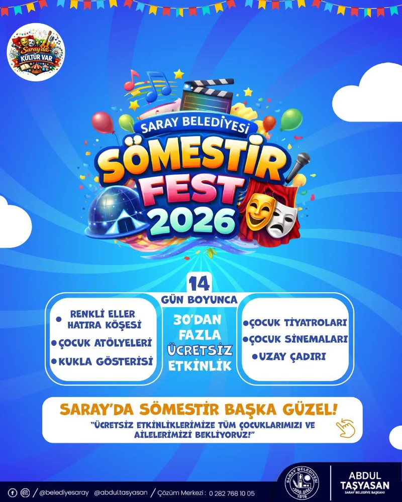 Saray Belediyesi, yarıyıl tatilini verimli ve keyifli geçirmek isteyen çocuklar için Sömestir Fest 2026’yı hayata geçiriyor. On dört gün sürecek festival boyunca çocuklar, eğlence ve eğitimi bir arada yaşayacakları zengin bir etkinlik programıyla buluşacak.