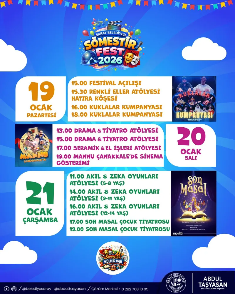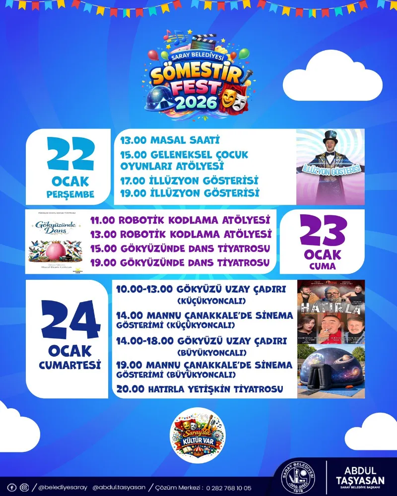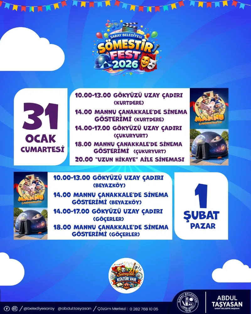 Saray Belediyesi, yarıyıl tatilinde çocukların hem eğlenip hem öğrenebileceği Sömestir Fest 2026’yı başlatıyor. Festival kapsamında 14 gün boyunca tiyatrodan sinemaya, atölyelerden planetaryuma kadar birçok etkinlik düzenlenecek.