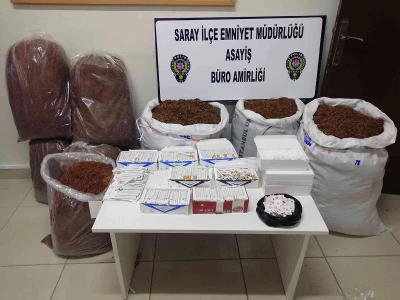 Olay, Saray ilçesinde meydana geldi. Alınan bilgilere göre, Ayaspaşa Mahallesi’nde bir işyerinde kaçak tütün satıldığı ihbarını alan Saray İlçe Emniyet Müdürlüğü Asayiş Büro ekipleri işyerine yaptıkları operasyonda 93 kilogram kıyılmış açık tütün, 1600 adet bandrolsüz doldurulmuş makaron, 1000 adet bandrolsüz boş makaron, 168 adet kesilmiş halde mükerrer olduğu değerlendirilen makaron bandrolü ele geçirdi. Olayla ilgili olduğu belirlenen G.Ö., A.Ö. ve A.Ö. isimli 3 şüpheli hakkında adli işlem başlatıldı.