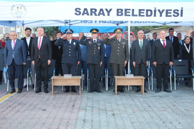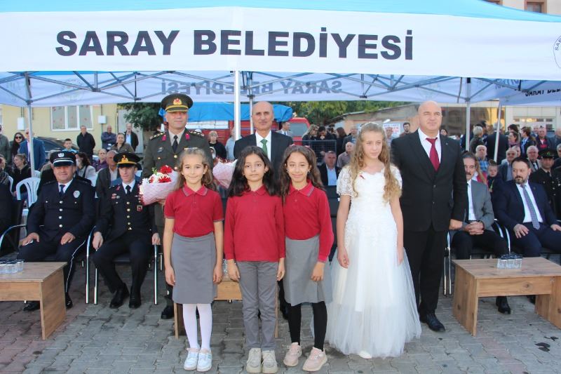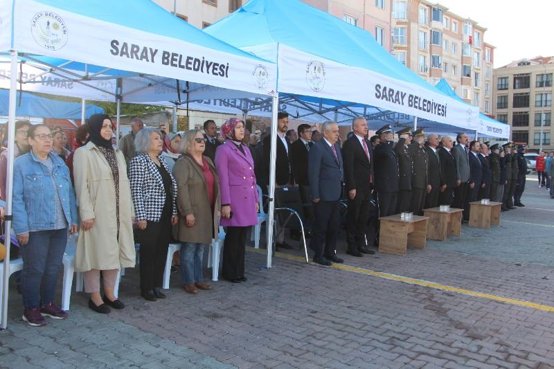 Saray’ın düşman işgalinden kurtuluşunun 100.yılı törenle kutlandı. 1 Kasım Salı günü saat 10.00’da Atatürk Alanı’nda çelenk sunumuyla başlayan tören, saygı duruşu ve İstiklal Marşı ile devam etti. Atatürk Alanı’nda gerçekleşen çelenk törenine Saray Kaymakamı Adem Ünal, Saray Garnizon Komutanı Kurmay Albay Barış Terzibaş, Tekirdağ Büyükşehir Belediye Başkanı Kadir Albayrak, Saray Belediye Başkanı Özgen Erkiş, Ak Parti Saray İlçe Başkanı Samet Derviş, Cumhuriyet Halk Partisi Saray İlçe Başkanı Akın Aytaç, Milliyetçi Hareket Partisi Saray İlçe Başkanı Yusuf Duman, İYİ Parti Saray İlçe Başkanı Abdullah Ataman, Saadet Partisi Saray İlçe Başkanı Şaban Mısırlı, DEVA Partisi Saray İlçe Başkanı Tarık Atansoy, Saray İlçe Jandarma Komutanı Üsteğmen Emrah Kaya, Saray İlçe Emniyet Müdürü Vahap Uyar, Saray Belediye Başkan Yardımcıları Birdal Gökdağ, Fuat Ünal, Saray İlçe Milli Eğitim Müdürü Reşat Uçak, siyasi parti ve STK temsilcileri, belediye meclis üyeleri, kaymakamlık daire amirleri, muhtarlar, öğretmenler ve öğrenciler katıldı.