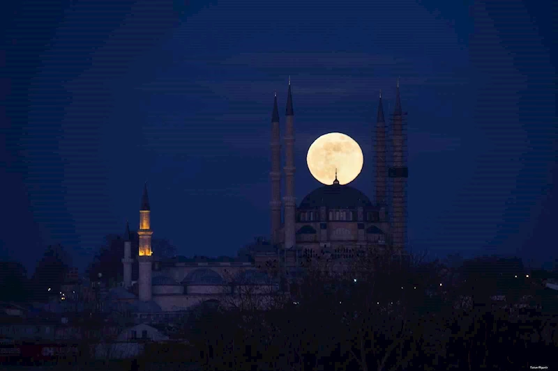 Edirne’de gökyüzünden beliren yılın son dolunayı ile Selimiye Camii’nin görüntüsü görsel şölen sundu.