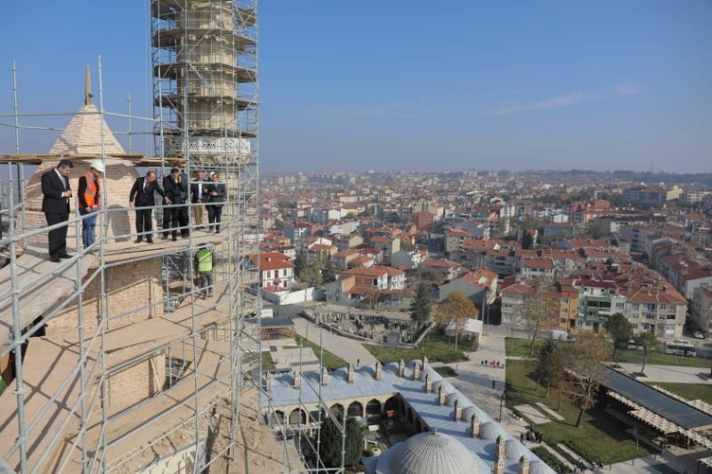 Aylardır süren hummalı çalışmalar çerçevesinde, caminin kalem işleri aslına uygun şekilde restore edildi. Minarelere kurulan iskelelerde işçiler, restorasyon çalışmalarını tarihi yapının aslına uygun şekilde gerçekleştiriyor. Kubbeler, minareler, kapılar, kalem işçiliği gibi birçok alanda çalışmalar devam ediyor. İhtişamıyla ziyaretçilerin beğenisini toplayan ve şehre giriş yapıldığında her taraftan görülen Selimiye Camii, restorasyonunun tamamlanmasıyla en az 100 yıl daha, sağlam şekilde ziyaretçilere kendisini gösterecek. İskeleye çıkan Edirne Valisi H. Kürşat Kırbıyık, çalışmaları yakından takip ederek incelemelerde bulundu.