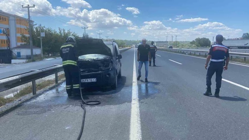 Tekirdağ Çorlu’dan Çerkezköy’e seyir halinde olan hafif ticari araç, Veliköy 1. Işıklar mevkiinde motor kısmından alev aldı.