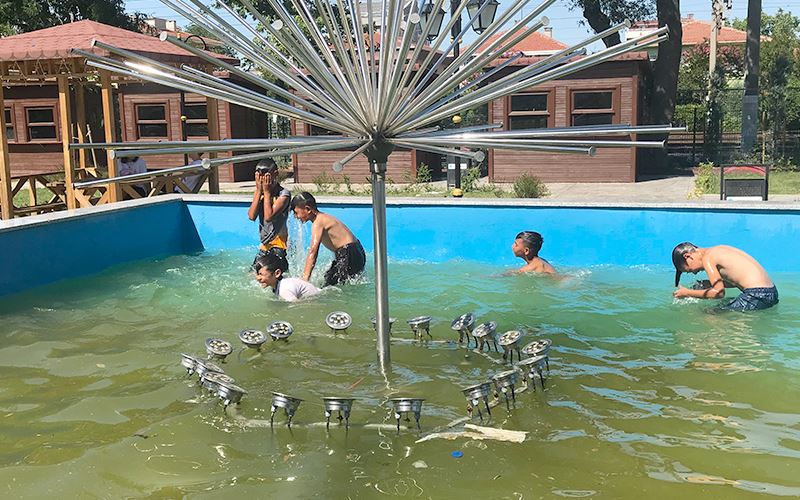 Sıcaktan bunalan çocuklar süs havuzlarına girerek serinledi.