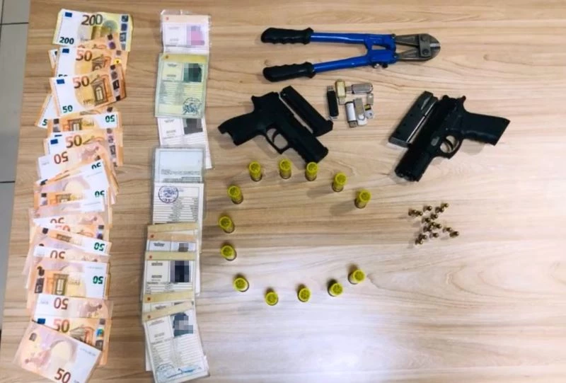 Evde yapılan aramada çekyatın gizli bölmesine ve banyoda duşakabinin üstündeki boşluğa gizlenmiş seri numaraları silinmiş silahların yanı sıra, tel kesme makası, bin 450 euro para, dolu saçma kapsülü, çok sayıda muhtelif USB, çok sayıda göçmene ait muhtelif illerden geçici koruma belgeleri ele geçirildi.