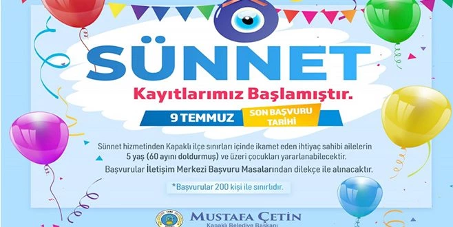 Kapaklı Belediyesi tarafından her yıl geleneksel olarak düzenlenen ücretsiz ?Sünnet Hizmeti? başvuruları devam ediyor. Kapaklı  sınırları içerisinde ikamet eden ihtiyaç sahibi ailelerin 5 yaşını doldurmuş ve üzeri çocuklarının yararlanabileceği kayıtlar 9 Temmuz?da sona erecek.
