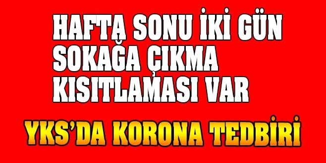 27 Haziran Cumartesi ve 28 Haziran 2020 Pazar günü yapılacak olan Yükseköğretim Kurumları Sınavı (YKS) öncesi ve sonrasında oluşabilecek yoğunluğu ve bulaşma riskini azaltmak, sınavın sorunsuz bir şekilde yapılmasını temin etmek amacıyla; cumartesi günü saat 09.30 ile 15.00 arasında ve Pazar günü 09.30 ile 18.30 saatleri arasında istisnalar hariç olmak üzere 81 ilde sokağa çıkma kısıtlaması uygulanacak. Belirtilen istisnalar hariç olmak üzere 81 il sınırları içinde bulunan vatandaşların bu saat aralıklarında sokağa çıkması kısıtlanacak.