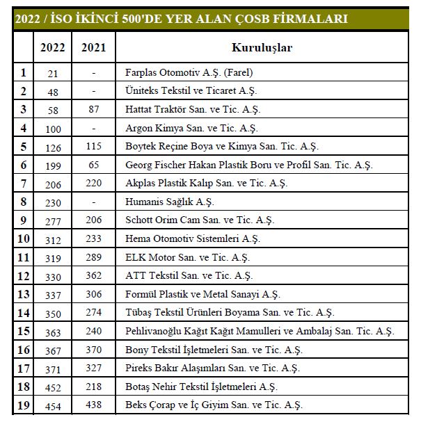 İstanbul Sanayi Odası (İSO), ‘Türkiye’nin İkinci 500 Büyük Sanayi Kuruluşu-2022’ araştırmasının sonuçlarını da açıkladı. İSO İkinci 500 Büyük’te Çerkezköy Organize Sanayi Bölgesi’nden (ÇOSB) 19 sanayi kuruluşu yer aldı. İSO’nun En Büyük 500 araştırmasına 2021 rakamlarına göre ÇOSB’den 17 firma girmişti. Böylece İSO 1000-2022’ye ÇOSB’den 36 firma girmiş oldu.