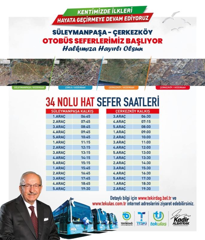 17 Nisan 2023 Pazartesi günü Süleymanpaşa- Çerkezköy arasında başlayacak olan seferler; TEKULAŞ’a ait 34 numaralı hat ile Süleymanpaşa Yeni Otogar’dan kalkarak Tekirdağ Şehir Hastanesi- NKÜ Araştırma Hastanesi- Çorlu- Çerkezköy arasında hizmet verecek. Vatandaşlarımız araç güzergâhındaki aktif kullanılan tüm duraklardan indi bindi yapabilecek.