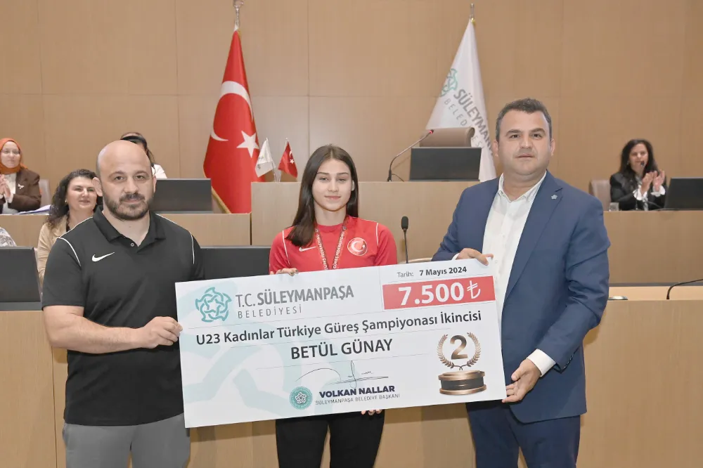 Toplantıyı açılış konuşması ile başlatan Süleymanpaşa Belediye Başkanı Volkan Nallar, gündem maddelerinin görüşülmesine geçmeden önce; 27-28 Nisan tarihleri arasında Konya’da yapılan Türkiye Duran Koçak 23 Yaş altı Kadınlar Güreş Şampiyonasında 53 kg kategorisinde Türkiye ikincisi olarak Gümüş Madalya kazanan Süleymanpaşa Belediyesi Gençlik ve Spor Kulübü sporcusu Betül Günay’ı meclis üyelerinin huzuruna davet ederek kutladı. Nallar, başarılı sporcuya Süleymanpaşa Belediyesi adına 7 bin 500 TL ödül takdim etti.