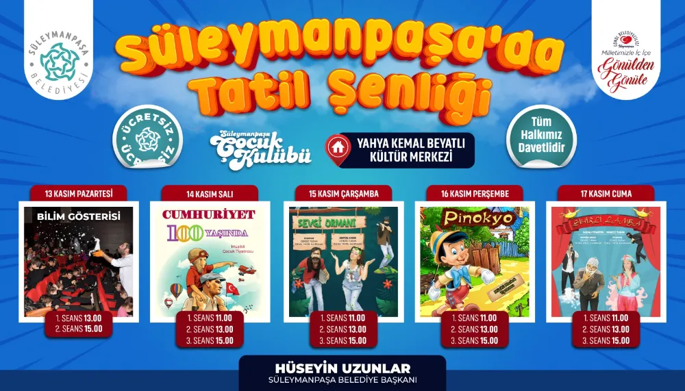 Kasım ayı ara tatili dolayısıyla eğitim-öğretime bir hafta ara verilirken, Süleymanpaşa Belediyesi, tiyatrolar, bilim gösterileri ve Cumhuriyetimizin 100. Yılı’na özel olarak hazırlanan sahne gösterisi gibi birbirinden farklı, eğlenceli ve eğitici etkinlikler organize etti. 13 Kasım Pazartesi ve 17 Kasım Cuma günleri arasında her gün öğrencileri ağırlayacak olan etkinlikler, tamamen ücretsiz olacak.