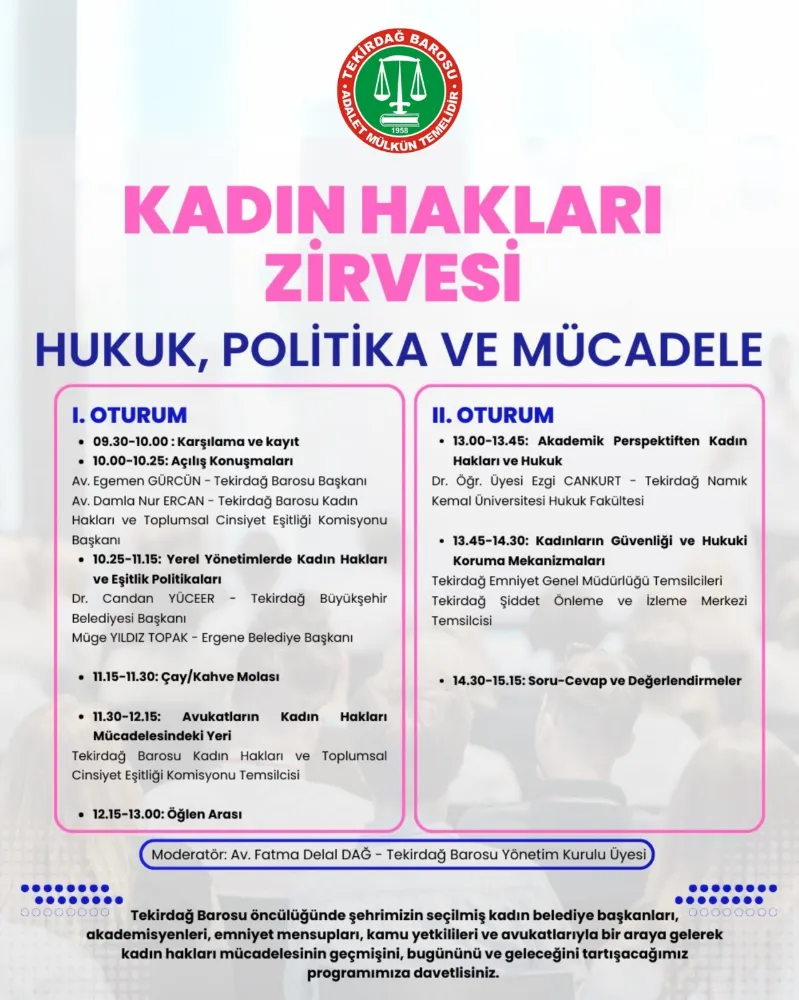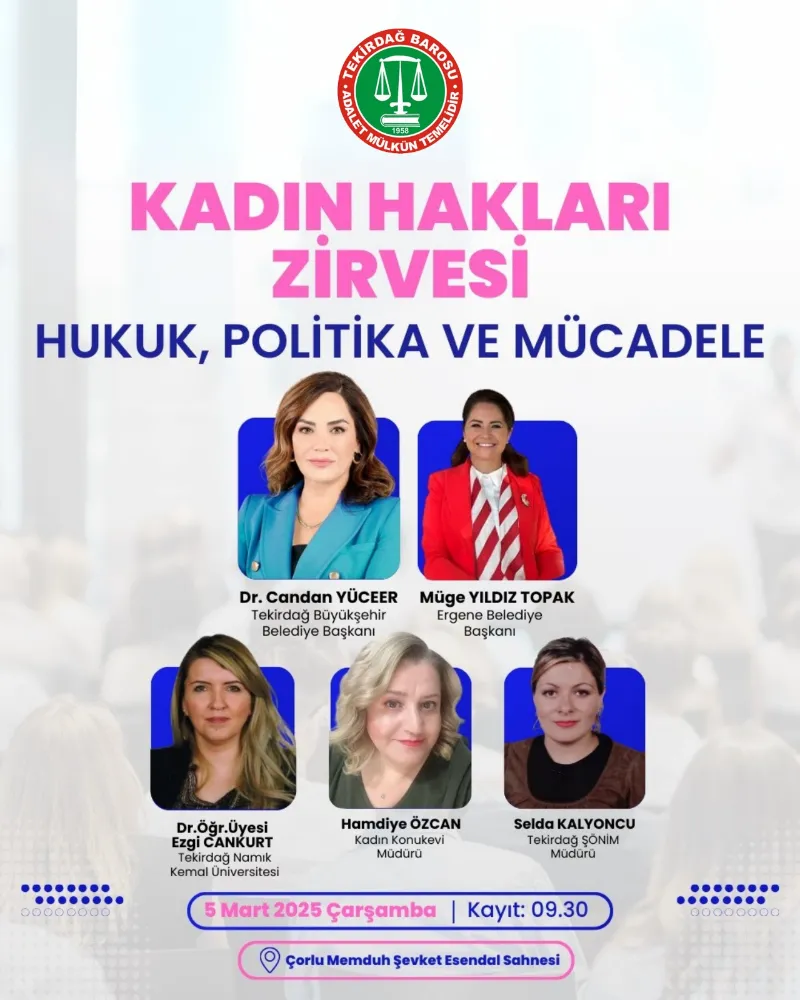 “Tekirdağ Barosu Başkanlığınca, 5 Mart 2025 Çarşamba günü saat 09:30'da, Çorlu Memduh Şevket Esendal Sahnesi'nde ‘Kadın Hakları Zirvesi’ düzenlenecektir. Zirvemizde, Tekirdağ Büyükşehir Belediye Başkanı Sayın Dr. Candan Yüceer ve Ergene Belediye Başkanı Sayın Müge Yıldız Topak'ın katılımlarıyla, emniyet mensupları, kamu yetkilileri, akademisyenler ve meslektaşlarımız bir araya gelecektir. Etkinlikte, kadın hakları mücadelesinin geçmişi, bugünü ve geleceği ele alınacaktır. Tüm halkımız davetli olup, siz değerli basınımızı da aramızda görmekten mutluluk duyarız.”