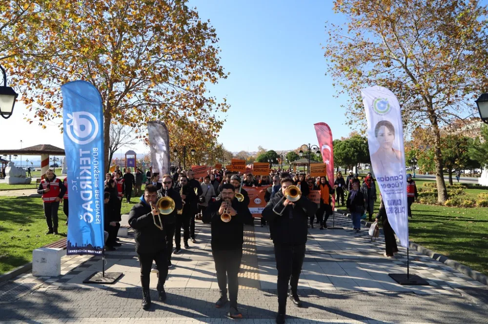 Törende ayrıca Vali Yardımcısı Mustafa Güler ile Aile ve Sosyal Hizmetler İl Müdürü Hüseyin Özdemir de bir konuşma yaparak Kadına karşı şiddetin önlenmesine yönelik çalışmaların önemine dikkat çektiler ve yapılan çalışmalar hakkında bilgiler verdiler. Konuşmaların ardından, geniş çaplı bir katılımla gerçekleştirilen yürüyüşte Tekirdağ hep bir ağızdan ‘Kadına Şiddete Hayır’ diye haykırdı. Tekirdağ Büyükşehir Belediyesi Bando ve Kent Orkestrası da çaldığı şarkı ve marşlarla yürüyüşün coşkusunu bir kat daha artırdı.
