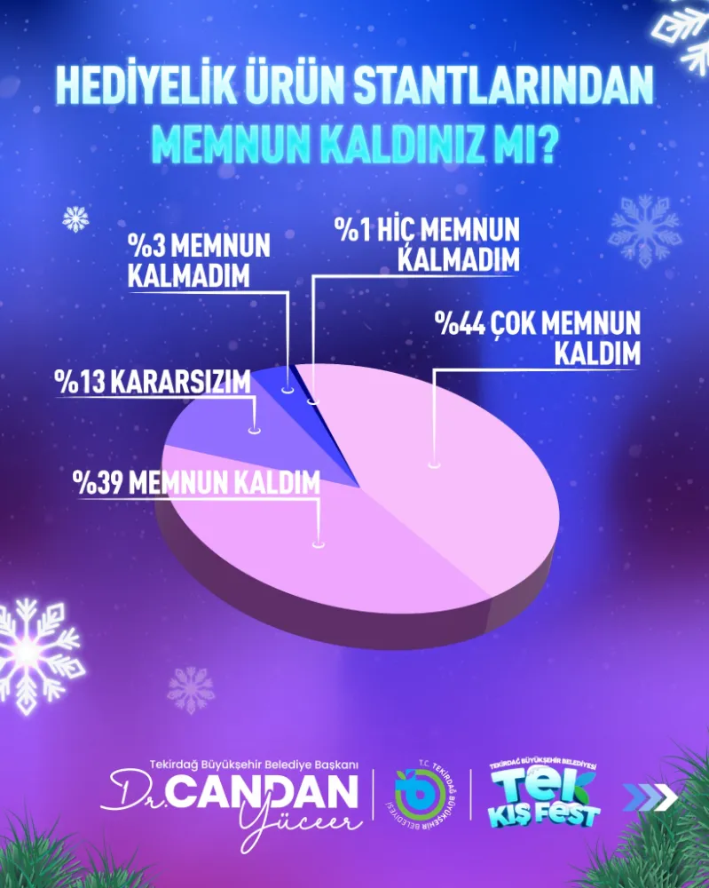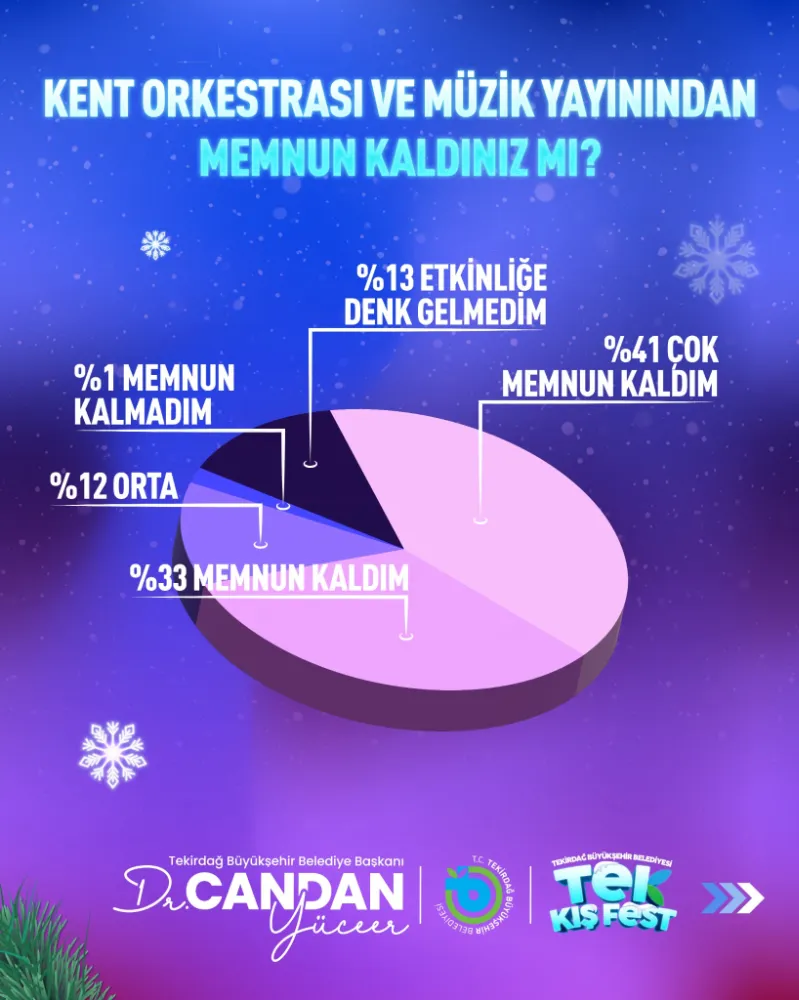 Tekirdağ Büyükşehir Belediyesi tarafından düzenlenen "TEK Kış Fest", kentin sosyal yaşamına damga vurdu. Etkinlik sonrası gerçekleştirilen memnuniyet anketi, vatandaşların festivale olan yoğun ilgisini ve memnuniyetini gözler önüne serdi. Katılımcıların yüzde 96’sı tek bir ağızdan aynı cevabı verdi: "TEK Kış Fest her yıl düzenlensin!"