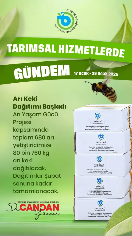 Arı Yaşam Gücü Projesi ise Süleymanpaşa Sebze ve Meyve Hali’nde düzenlenen törenle başladı. Proje kapsamında; 680 arı yetiştiricisine 80 bin 760 kg arı keki dağıtılacak. Dağıtımlar Şubat ayı sonuna kadar tamamlanacak.