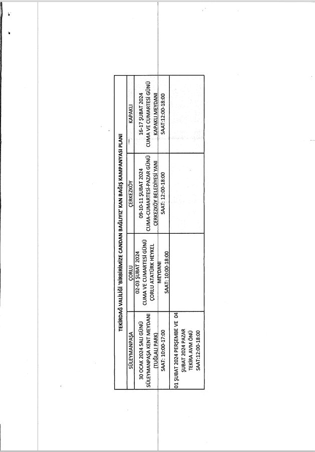 Tekirdağ Valiliği ile Türk Kızılay'ı iş birliği içinde ‘Birbirimize Candan Bağlıyız’ sloganıyla yapılacak kan bağış kampanyası, 30 Ocak 2024 tarihinde saat: 10:00-17:00 arasında Süleymanpaşa Kent Meydanı’nda Tekirdağ Valisi Recep Soytürk'ün katılımlarıyla başlatılacak. Kan bağış kampanyası Süleymanpaşa, Çorlu, Çerkezköy ve Kapaklıilçelerini de kapsayacak.
