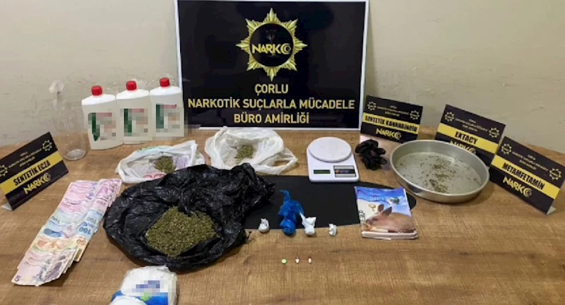 Tekirdağ İl Emniyet Müdürlüğü Narkotik Suçlarla Mücadele Şube Müdürlüğünce yapılan günlük ve planlı çalışmalarda Malkara, Çerkezköy, Çorlu ve İstanbul Çekmeköy ilçesinde 10 adrese operasyon düzenlendi. 10 ayrı ikamet aramalarında, 552 gram sıvı halde sentetik kannabinoid maddesi üretiminde kullanılan kimyasal madde, katı halde 37,50 gram sentetik kannabinoid maddesi üretiminde kullanılan A-M kimyasal ham madde, 71,9 gram sentetik kannabinoid, uyuşturucu madde üretiminde kullanılan 1 adet sprey ve 3 adet kutu içerisinde aseton maddesi, 790 adet sentetik ecza hap, 141 gram esrar, 3 fişek halinde 2 gram metamfetamin, 66 adet gümrük kaçağı içki ve 23 paket gümrük kaçağı sigara, 1 adet ecstasy hap, 1 adet hassas terazi, 1 adet tabanca ve suçtan elde edildiği değerlendirilen 3 bin 145 TL para ele geçirildi.
