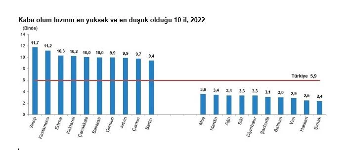 Türkiye İstatistik Kurumu Başkanlığı Ölüm ve Ölüm Nedeni İstatistiklerinden yararlanarak ‘Tekirdağ İli Ölüm ve Ölüm Nedeni İstatistikleri, 2022’ başlıklı veriler yayımlandı. Buna göre, Bin kişi başına düşen ölüm sayısını ifade eden kaba ölüm hızı, 2021 yılında binde 6,7 iken 2022 yılında binde 5,9 oldu. Diğer bir ifade ile 2021 yılında bin kişi başına 6,7 ölüm düşerken 2022 yılında bin kişi başına 5,9 ölüm düştü. Kaba ölüm hızının en yüksek olduğu iller, 2021 yılında binde 12,7 ile Sinop ve Kastamonu oldu. Kaba ölüm hızının en yüksek olduğu il, 2022 yılında binde 11,7 ile Sinop oldu. Bu ili binde 11,2 ile Kastamonu, binde 10,3 ile Edirne, binde 10,2 ile Kırklareli izledi. Kaba ölüm hızının en düşük olduğu il ise binde 2,4 ile Şırnak oldu. Bu ili binde 2,5 ile Hakkari, binde 2,9 ile Van ve binde 3,0 ile Batman izledi. Tekirdağ ise binde 6,4 ile en yüksek iller arasında 48. sırada yer aldı.