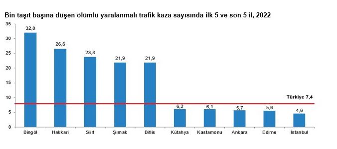 İllere göre ölümlü yaralanmalı kaza sayıları incelendiğinde bin taşıt başına en fazla ölümlü yaralanmalı kazanın Bingöl'de (32) en az İstanbul'da (4,6) gerçekleştiği görüldü. Tekirdağ iline bakıldığında ise bu oranın 9,3 olduğu görüldü.
