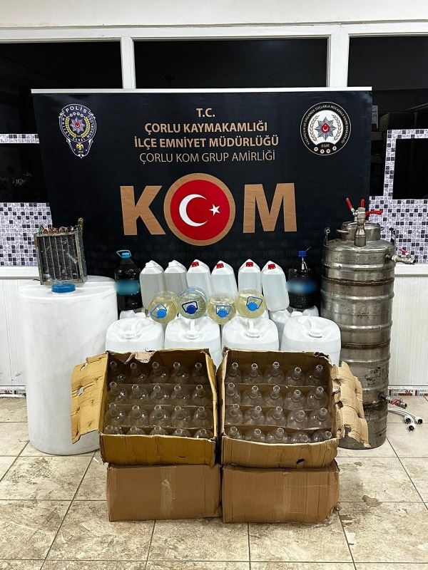 Tekirdağ İl Emniyet Müdürlüğü Kaçakçılık ve Organize Suçlarla Mücadele (KOM) Şube Müdürlüğünce, Çorlu ilçesinde sahte alkollü içki/etil alkol üretimi ve dağıtımı yaptığı tespit edilen şahsa ait ikamet ve araca operasyon gerçekleştirildi. Operasyonda; 530 litre sahte alkol, 100 adet boş viski şişesi, 10 litre viski esansı, çok sayıda kapüşon, farklı markalarda etil alkol etiketi, alkollü içki yapımında kullanılan çelik damıtma kazanı ve bidon ele geçirildi. Konu ile ilgili 1 şüpheli hakkında adli işlem başlatıldı.