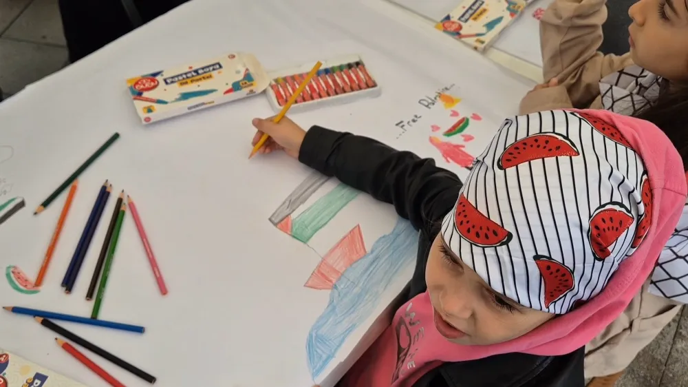 Etkinlikte küçük yaştaki çocuklar, Gazze’de yaşananlara karşı hissettiklerini kâğıtlara yansıtarak meydanda sergiledi. Katılımcılar, çocukların çizdiği resimlere yoğun ilgi gösterdi.