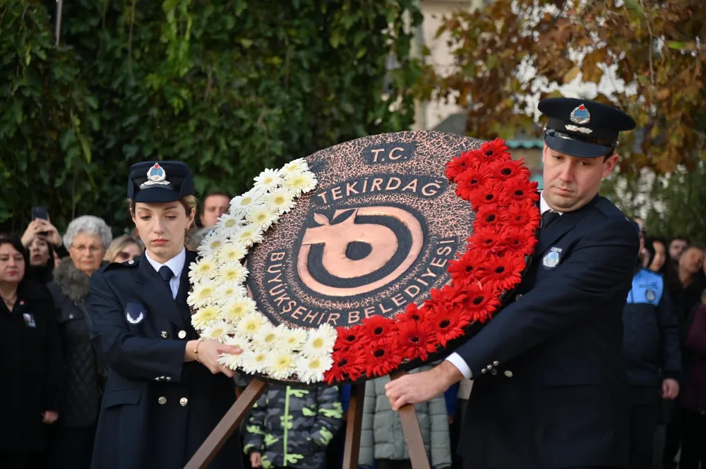 10 Kasım Atatürk’ü Anma Günü ve Atatürk Haftası kapsamında, Süleymanpaşa ilçesindeki tarihi Tekirdağ Valiliği önünde bulunan Atatürk Anıtı’na çelenk sunulmasıyla törenler başladı. Valilik çelengini Tekirdağ Valisi Recep Soytürk, Garnizon Komutanlığı çelengini Tuğgeneral Ahmet Uğurlu, Büyükşehir Belediyesi çelengini ise Tekirdağ Büyükşehir Belediye Başkanı Dr. Candan Yüceer sundu. Gazi Mustafa Kemal Atatürk’ün aramızdan ayrıldığı saat olan 09.05’te çalan sirenle birlikte Tekirdağ’da hayat durdu ve 2 dakikalık saygı duruşunda bulunuldu. Atatürk Anıtı’ndaki bayraklar yarıya indirildi ve İstiklal Marşı’nın okunmasıyla tören sona erdi. Duygusal anların yaşandığı törenin ardından protokol üyeleri ve katılımcılar anıta karanfiller bıraktı.