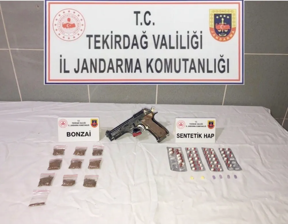 Hayrabolu Aydınevler Mahallesi’nde İ.B. isimli şahsın evinde ve aracında yapılan aramada, 51 adet sentetik hap, 35 gram bonzai, 1 adet ruhsatsız tabanca ele geçirildi.