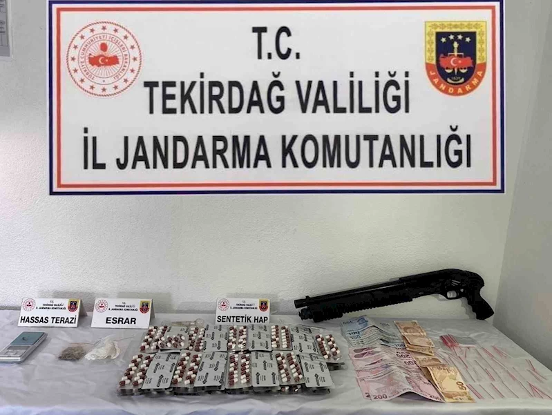 Tekirdağ İl Jandarma Komutanlığınca Çorlu Cemaliye Mahallesi’nde M.G. isimli şahsın evinde yapılan aramada; 721 adet sentetik hap, 10 gram kenevir tohumu, 4 gram esrar, 8 adet uyuşturucu kullanma aparatı, 1 adet av tüfeği, 1 adet hassas terazi, 20 adet kilitli poşet, 4 bin TL suçtan elde edildiği değerlendirilen para ele geçirildi.
