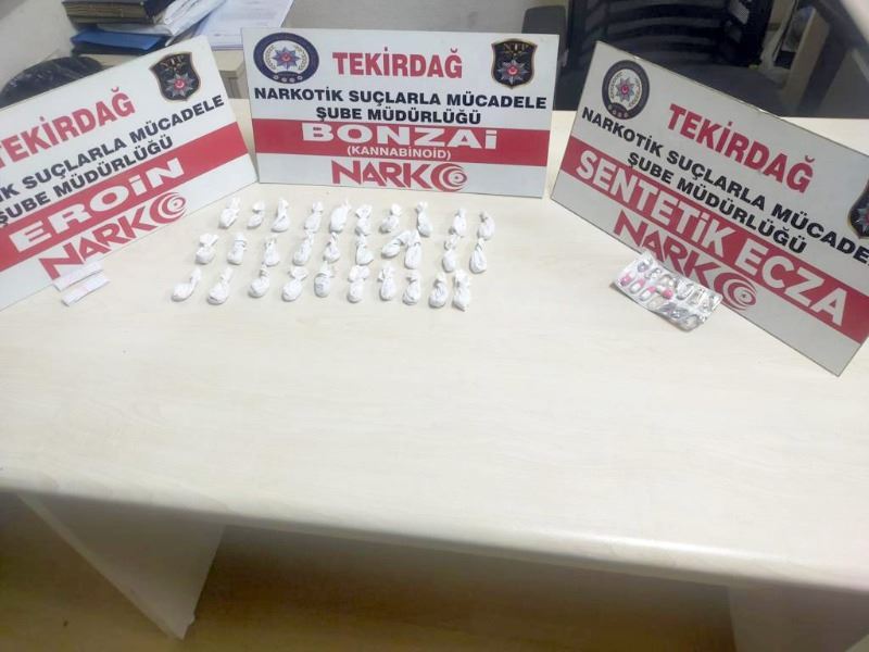 Tekirdağ İl Emniyet Müdürlüğü Narkotik ekipleri, kent genelinde uyuşturucuya geçit vermiyor. Polis ekiplerince il genelinde önceden belirlenen adreslere düzenlenen operasyonlarda, 294,16 gram 164 fişek eroin, 631 adet extacy hap, 107,35 gram 21 fişek metamfetamin, 123 gram 55 fişek bonzai, 17,37 gr 12 fişek esrar-skunk, 2,65 gam 1 fişek kokain-crack, 2 adet ruhsatsız tabanca, 1 adet ruhsatsız av tüfeği, 4 bin 424 tl para ele geçirildi. Operasyonda 83 kişi gözaltına alınırken, adliyeye sevk edilen 13 kişi tutuklanarak, cezaevine gönderildi.