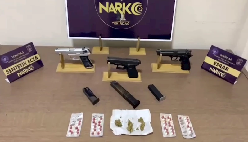 Çorlu ilçesinde bir ikamet adresinde yapılan aramada; 4 fişek esrar, 41 adet sentetik ecza ve 3 adet ruhsatsız tabanca (bunlardan biri seri aparatlı) ele geçirildi.