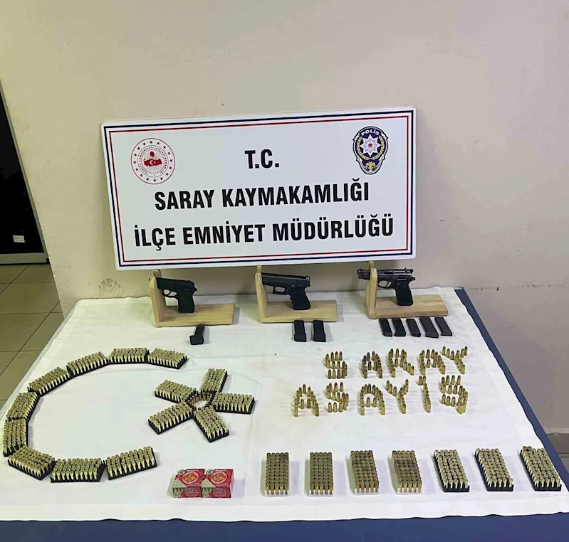 Edinilen bilgilere göre, Saray ilçesinde yapılan saha çalışmalarında R.A. isimli şahsın ikametinde ruhsatsız silah bulundurduğuna dair bilgi üzerine harekete geçildi. Alınan arama kararı ile şahsın evine düzenlenen operasyonda, 1 adet Glock-19 Austria ibareli ruhsatsız tabanca ve 2 şarjör, 1 adet Baretta ibareli ruhsatsız tabanca ve 4 şarjör, 1 adet Zoraki Mod.914 ibareli kuru sıkı tabanca ve 1 şarjör ele geçirildi. Ayrıca, 917 adet 7.65 milimetre ve 344 adet 9.19 milimetre çapında fişek bulundu.