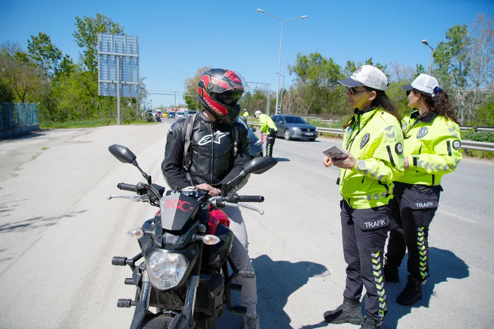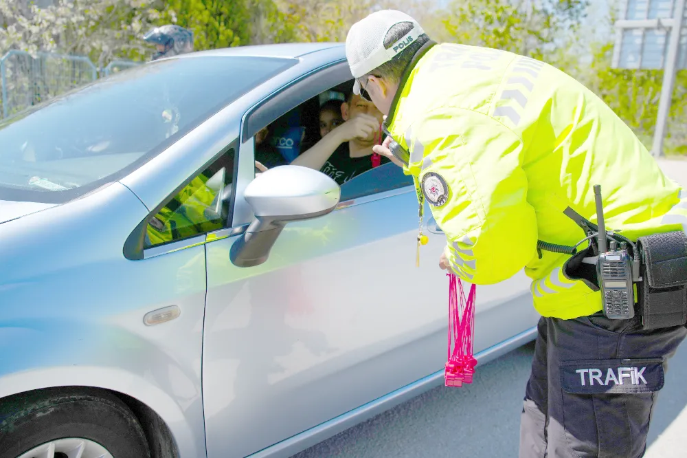 Trafik polisleri, emniyet kemerinin hayati önem taşıdığını ve herkesin takması gerektiğini vurgulayarak, yolda olan vatandaşlarla bayramlaştı.