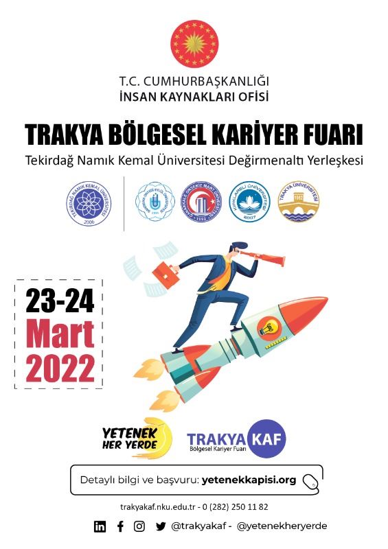 Trakya Bölgesinde ikinci defa düzenlenecek olan Trakya Bölgesel Kariyer Fuarı (TRAKYAKAF), Tekirdağ Namık Kemal Üniversitesi ev sahipliğinde ve Bandırma Onyedi Eylül Üniversitesi, Çanakkale Onsekiz Mart Üniversitesi, Kırklareli Üniversitesi, Trakya Üniversitesi paydaşlığında, 23-24 Mart 2022’de Tekirdağ Namık Kemal Üniversitesi Değirmenaltı Yerleşkesinde gerçekleştirilecektir. Birçok sektöre ait kariyer fırsatlarının, meslek bilgilerinin ve istihdam süreçlerinin paylaşılacağı ve özel sektörden yüzlerce firma ile kamu sektöründen çeşitli kurumların katılacağı Trakya Bölgesel Kariyer Fuarı, her bölümden öğrenci ve mezunlar ile bölgede bulunan vatandaşların katılımına açık olarak organize edilecektir.