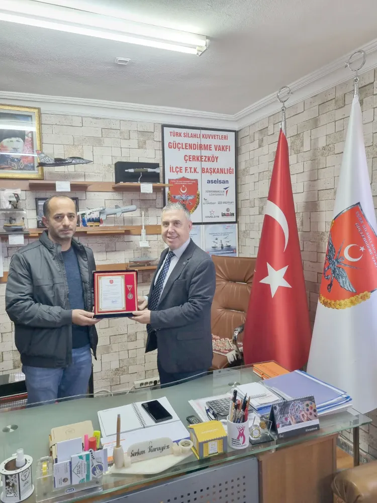 TSKGV Şube Başkanı Serkan Karagöz, Çerkezköy Paksoy Fabrikası’nda işçi olarak çalışan Yaşar Çokel adlı vatandaşın TSKGV’ye yaptığı nakti bağışı kabul etti. Bu anlamlı bağış karşısında TSKGV Şube Başkanı Serkan Karagöz de Yaşar Çokel’e günün anısına madalya ve bir de plaket takdim etti. Çokel’e teşekkür eden Karagöz, “TSKGV için bugün anlamlı bir gündü. Çerkezköy Paksoy Fabrikası’nda çalışan bir kardeşimiz Yaşar Çokel Türk silahlı kuvvetleri Güçlendirme Vakfı’na nakit bağışta bulunarak, örnek bir tavır sergilemiştir. Bizlerde TSKGV olarak kendisine bir madalya ve plaket vererek çok teşekkür ettik. Vatanımız milletimiz için sizlerin bağışları bizim için çok kıymetli, verdiğiniz her kuruş ülkemizin savunma sanayii için kullanılmaktadır.” dedi.