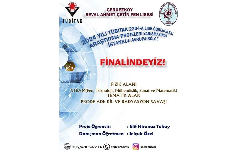 2024 Yılı TÜBİTAK 2204-A Lise Öğrencileri Araştırma Projeleri Yarışması’na katılan Çerkezköy Seval Ahmet Çetin Fen Lisesi öğrencisi Elif Hiranaz Tokay, ‘Kil ve Radyasyon Savaşı’ adlı projesiyle finalist olmaya hak kazandı. Danışman Öğretmen Selçuk Özel’le yarışmaya katılan Seval Ahmet Çetin Fen Lisesi öğrencisi Tokay, FİZİK ALAN STEAM (Fen, Teknoloji, Sanat ve Matematik) TEMATİK ALAN’ konularında yarışmaya katıldı.