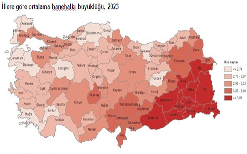 Hane halkı, aralarında akrabalık bağı bulunsun ya da bulunmasın aynı konutta yaşayan bir veya birden fazla kişiden oluşan topluluktur. Diğer bir ifade ile hane halkı, bir aileden oluşabileceği gibi birden fazla aileden de oluşabilmektedir. Adrese Dayalı Nüfus Kayıt Sistemi (ADNKS) sonuçlarına göre, Türkiye'de 2008 yılında 4 kişi olan ortalama hane halkı büyüklüğünün, azalma eğilimi göstererek 2023 yılında 3,14 kişiye düştüğü görüldü. Türkiye'de 2023 yılında ortalama hane halkı büyüklüğünün en yüksek olduğu il, 4,86 kişi ile Şırnak oldu. Şırnak ilini 4,67 kişi ile Şanlıurfa ve 4,61 kişi ile Batman izledi. Ortalama hane halkı büyüklüğünün en düşük olduğu iller ise 2,54 kişi ile Çanakkale oldu. Bu ili, 2,60 kişi ile Giresun ve 2,61 kişi ile Balıkesir izledi. Tekirdağ ili ise 3,05 ile en düşük 42’inci il oldu.