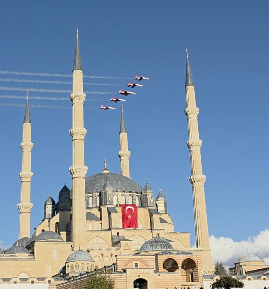Mimar Sinan’ın eşsiz şaheseri Selimiye Camii üzerinde akrobatik manevralar yapan Türk Yıldızları, gökyüzünü adeta kırmızı beyaza boyadı. Yaklaşık yarım saat süren gösteride ay yıldızlı jetlerin senkronize uçuşları, meydanı dolduran binlerce Edirneli tarafından büyük beğeniyle izlendi. Vatandaşlar gökyüzündeki gösteriye alkışlarla eşlik ederken, ellerindeki Türk bayraklarıyla pilotlara sevgi gösterisinde bulundu. Gösteriyi izleyenler, bu tarihi anı cep telefonlarıyla kaydederek ölümsüzleştirdi.