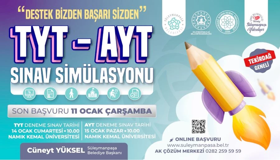 Süleymanpaşa Belediyesi tarafından 14-15 Ocak tarihlerinde Namık Kemal Üniversitesi’nde gerçek sınav ortamında TYT-AYT deneme sınavı gerçekleştirilecek. Tamamen ücretsiz olan sınavla ilgili tüm ücretler Süleymanpaşa Belediyesi tarafından karşılanacak.