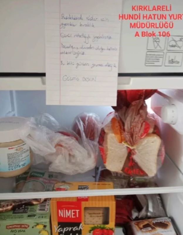 Kırklareli’nde bazı üniversite öğrencileri, yurttaki odalarına yerleştirilecek depremzedeler için “Hepinize geçmiş olsun. Burada bıraktıklarımız sizin için helal, hoş olsun umarım işinize yarar. Dualarımız sizinle” gibi notlar yazarak odalarında bulunan yiyecek ve temizlik ürünleri gibi malzemeleri almadan çıktı.